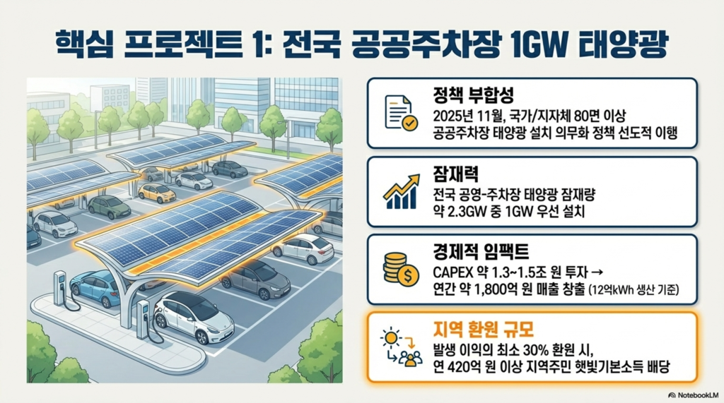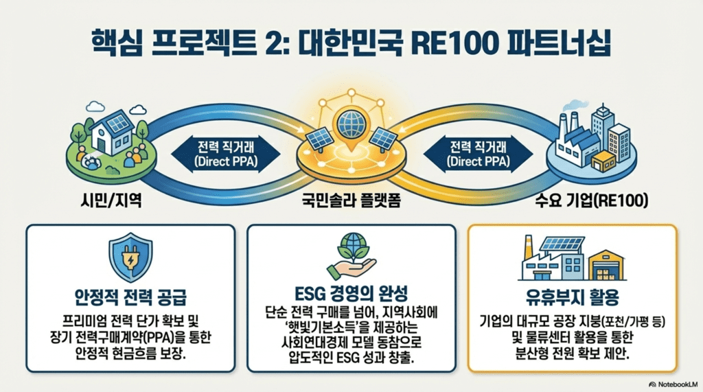 🏭 2. 대한민국 RE100… 국민과 함께 공공주차장 100곳에 태양광 의무화 대응 패키지를 제공하고, 지자체와 공공기관의 RE100 로드맵 수립 및 이행을 통합적으로 설계해 줍니다. 또한 전력 소모가 많은 산업단지 내 입주기업들을 위해 태양광과 에너지저장장치(BESS)를 결합한 분산형 전력 공급 모델도 제안합니다.